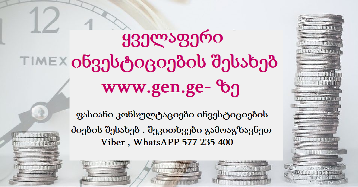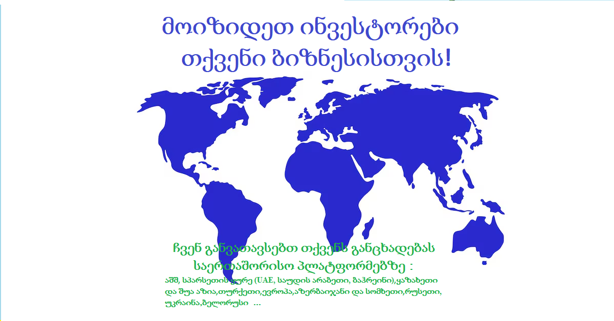 🌐 ეძებთ ინვესტორს? დაგეხმარებით თქვენი განცხადება განთავსდეს  საერთაშორისო პლატფორმებზე , მოგიმზადებთ საინვესტიციო პროექტსა და შეთავაზების (განცხადების) ტექსტს 577 235 400