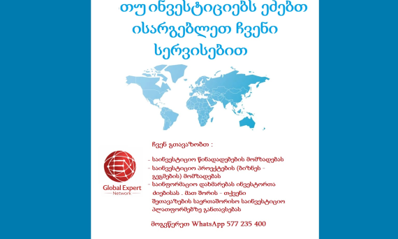 ჩვენ შეგვიძლია საინფორმაციო და საკონსულტაციო მომსახურება გაგიწიოთ ინვესტიციების, გრანტების, თანადაფინანსების, ბიზნესისა და უძრავი ქონების ყიდვა-გაყიდვის პროცესში