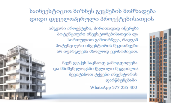 რა მოთხოვნები აქვს ინვესტორს დიდი დეველოპერული პროექტების მიმართ – სრული გზამკვლევი რატომ არის მნიშვნელოვანი ინვესტორის მოთხოვნების ცოდნა? დიდი დეველოპერული პროექტი — იქნება ეს საცხოვრებელი კომპლექსი, კომერციული ცენტრი თუ მრავალფუნქციური სივრცე — საჭიროებს სოლიდურ კაპიტალს. შესაბამისად, ინვესტორის მოთხოვნები დეველოპერულ პროექტზე უნდა იყოს წინასწარ გააზრებული და პროფესიონალურად დამუშავებული. ინვესტორი არ აფინანსებს მხოლოდ იდეას — ის აფინანსებს სტრუქტურირებულ,