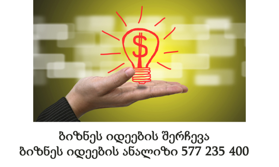 ბიზნეს იდეების ანალიზი და კონსულტაციები 577 235 400 თავიდანვე ჩაატარეთ ბიზნეს იდეების ანალიზი , მოიხმეთ დამოუკიდებელი ექსპერტები დაუშვებელია ბიზნესის მიმართულების არჩევა ყველა ალტერნატივის სისტემური ანალიზის გარეშე. შეაფასებინეთ თქვენს მიერ მოძიებული იდეა დამოუკიდებელ ექსპერტებს , პარტნიორებს, ახლობლებს. ეს დაგეხმარებათ განთავისუფლდეთ ემოციებისაგან და ობიეტურად შეაფასოთ იდეა. თუ საშუალება გაქვთ ამ საქმეშიც , სასურველია გამოცდილი კონსულტანტის მომსახურებით ისარგებლოთ