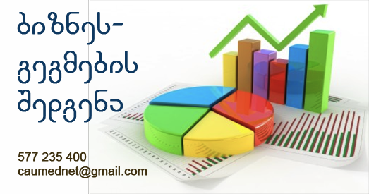 გრანტებისა და შეღავათიანი კრედიტების, ინვესტიციებისა და ბიზნესის რაციონალურად წარმართვისათვის გთავაზობთ დაბეჭდილ, მზა, ბიზნეს-გეგმებს, word-ის ფაილის სახით. მოგვწერეთ თქვენთვის სასურველი ბიზნესის დასახელება და მოკლე შინაარსი ელფოსტაზე caumednet@gmail.com ესკიზურ დონეზე გვაქვს 400-მდე მიმართულების ბიზნეს-გეგმა. თუკი ემთხვევა თქვენს მიმართულებას – მოკლე დროში დაგიბეჭდავთ. ბიზნეს გეგმების სიის სარჩევი, რუბრიკები: მიწის სტატუსის შესაცვლელი ბიზნეს გეგმების მომზადება 577 27 28 41